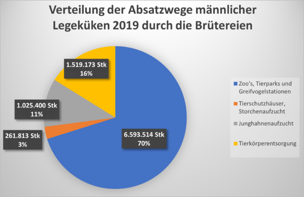 6,6 Mio bzw. 70% der im Jahr 2019 geschlüpften Hahnenküken wurden zur Fütterung an heimische Zoos, an Tierparks, Greifvogelstationen und Falkenzüchter abgegeben.